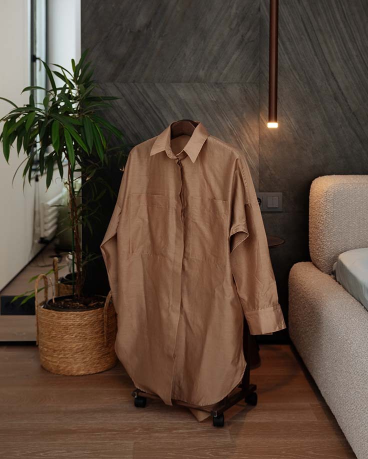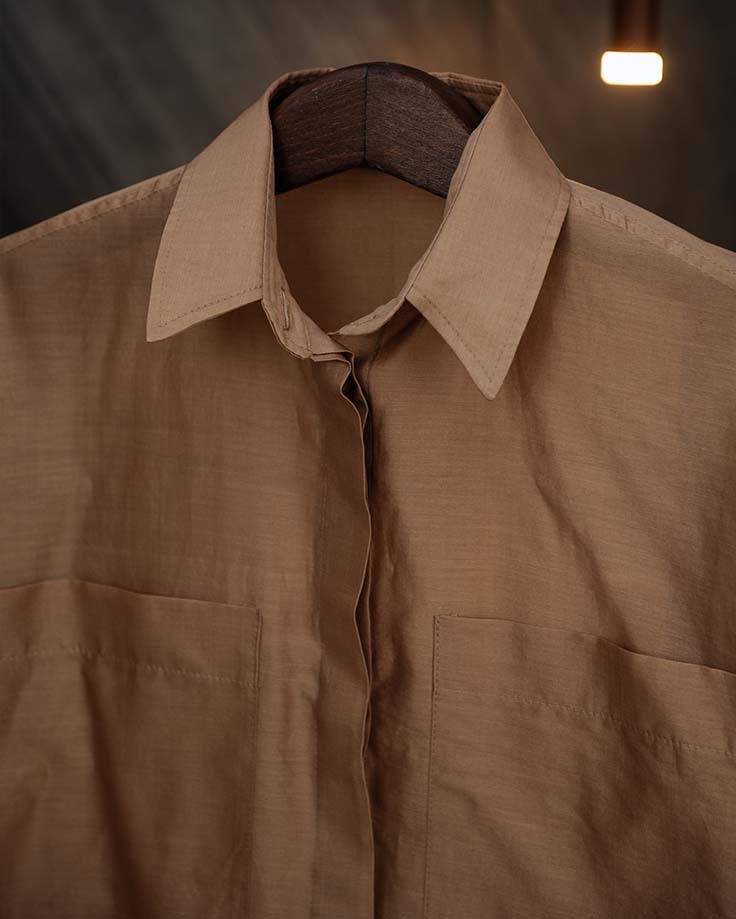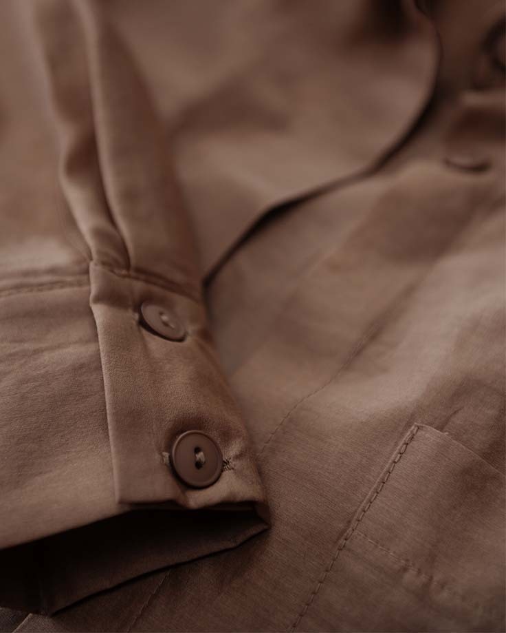 За счет того, что в составе ткани доминирует шелк, рубашка имеет красивый жемчужный блеск и деликатную прозрачность вуали. Эта рубашка – ваш верный спутник, готовый сопровождать вас как в дальних путешествиях, так и в повседневной жизни. Она станет вашей защитой в моменты уязвимости, вашим источником комфорта и напоминанием о том, что вы достойны самого лучшего. За счет легкости и хорошей воздухопроницаемости рубашка быстро сохнет и не нуждается в утюге, достаточно после стирки её встряхнуть и аккуратно развесить или разложить на поверхности.
